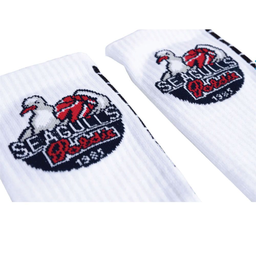 Sokker med ditt eget design. De personlige sokkene er helt skreddersydde med dine farger, design og logo. 80% bomull, 15% polypropylene og 5% lycra. Vi lager dine spesialtilpassede sokker fra 50 par per størrelse. Størrelser 35/37, 38/40, 41/43 og 44/46. Vi har et bredt lager av forskjellige farger. Vi kan maks sy 5 farger per linje. Ta kontakt med oss dersom ditt design inneholder mer enn 5 farger, avhengig av design kan dette fortsatt produseres.