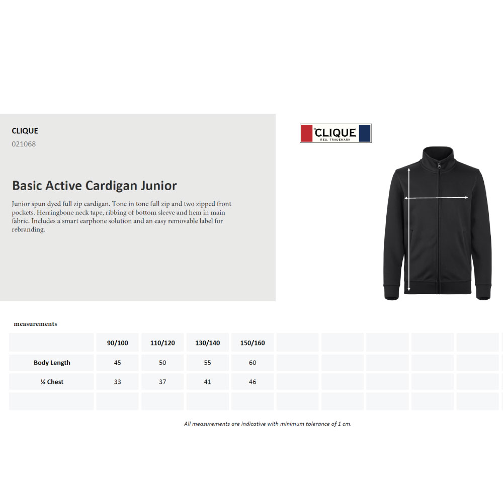 Spun dyed cardigan til junior med ton-i-ton glidelås i 100% polyester. 280g/m2. To lommer i front, Herringbone nakkebånd og ribb i nederkant og i ermavslutning. Tilpasset for hodetelefoner. Vaskes på 60 grader. OEKO-tex merket. Leveringstid ca 2 uker.